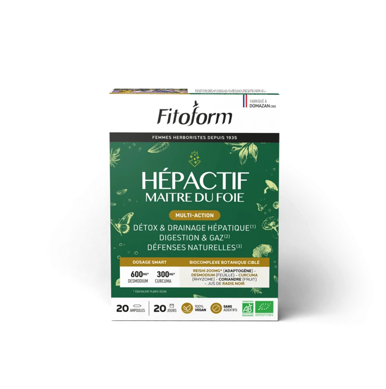 Le foie joue un rôle physiologique essentiel, c'est l'organe "clé" du métabolisme des glucides, lipides et protides, de la sécrétion de la bile, de l'épuration et de la désintoxication de l'organisme. Nausées, perte d'appétit, teint brouillé et fatigue sont souvent les signes d'un encombrement hépatique. Le Desmodium et le Curcuma présents dans HEPACTIF, sont reconnus pour protéger et régénérer la cellule hépatique ainsi que pour détoxiquer et stimuler les fonctions hépatodigestives.